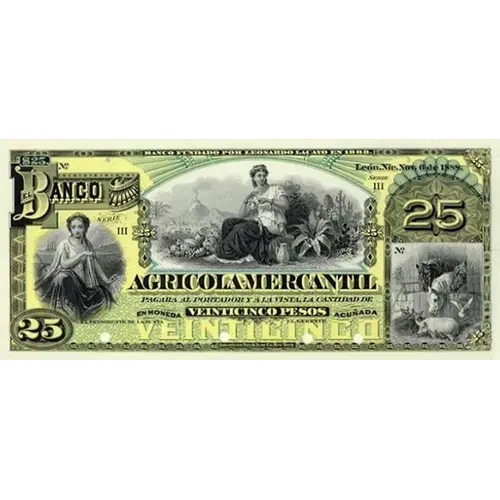 BANCO FUNDADO POR LEONARDO LACAYO EM 1888 León, Nic. Nov. 6 de 1888. EL BANCO AGRICOLA MERCANTIL Pagará al portador y a la vista la cantidad de VEINTICINCO PESOS EN MOEDA ACUÑADA VEINTICINCO American Bank Note Co., New York (Translation: Bank founded bt Leonardo Lacayo in 1888 León, Nic. November 6, 1888. The Mercantile Agricultural Bank It will pay to the bearer and on sight the amount of Twenty Five Pesos in minted currency American Bank Note Co., New York) |