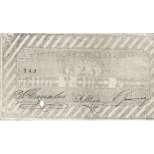 | Obverse lettering | 25 CREDITO DEL ESTADO DE TAMAULIPAS 249 $ 25 VEINTE Y CINCO PESOS MEXICO 1876 (Translation: 25 Credit from the State of Tamaulipas 249 $ 25, Twenty and five Pesos Mexico, 1876) |