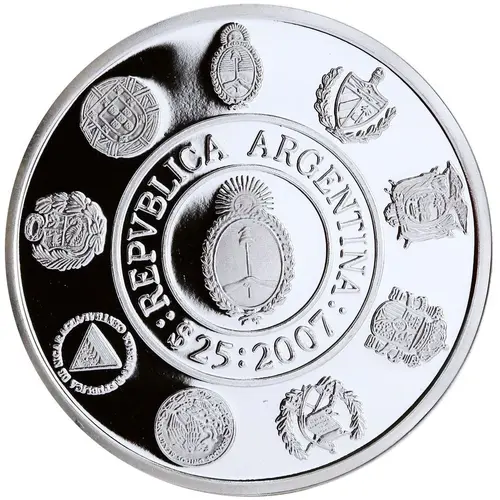 The Argentine National Coat of Arms is distinguished by the inscription `REPVBLICA ARGENTINA`, the face value `$ 25` and the year of `2007`. Surrounding our emblem, the shields of all participating countries. |