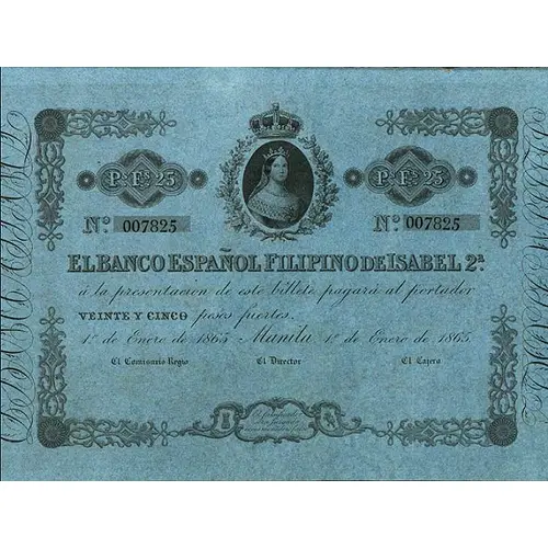 Obverse lettering EL BANCO ESPAÑOL FILIPINO DE ISABEL 2a á la presentacion de este billete pagará al portador VEINTE Y CINCO PESOS FUERTE MANILA