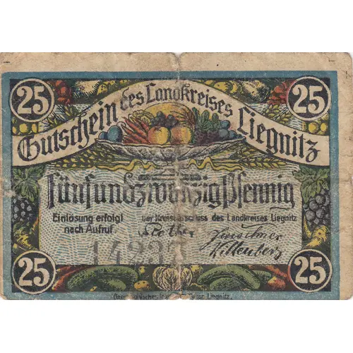 25 Gutschein des Landkreises Liegnitz Fünfundzwanzig Pfennig Einlösen erfolgt nach Aufruf. Der Kreisausschuss des Landkreises Liegnitz SN# |