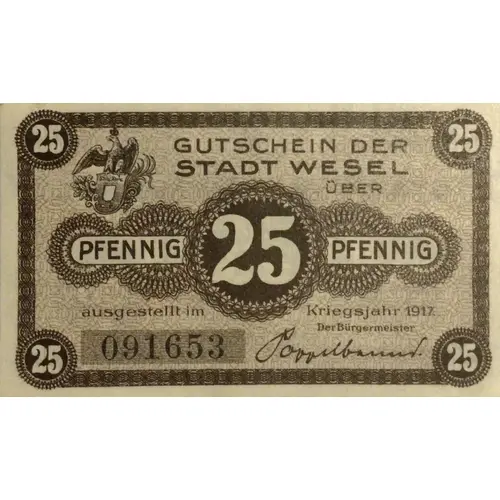 Gutschein der Stadt Wesel Über 25 Pfennig Ausgestellt im Kriegsjahr 1917 (Translation: Coupon of the city of Wesel 25 Pfennigs Issued in the war year of 1917) |