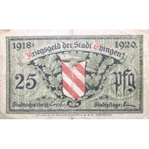 Kriegsgeld der stadt Ehingen 25 Pfg stadtschultheiß stadtpflege Unland`Sche Buchdruckerei G. M. B. H. Stuttgart (Translation: War money from the city of Ehingen 25 PFG City Leader(Mayor) City Maintenance Unland`s Book Printing G. M. B.H. Stuttgart) |