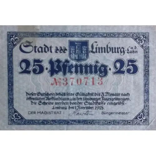 | Légende de l’avers | 25 25 25 25 Stadt Limburg a.d. Lahn 25 Pfennig 25 No.457076 Dieser Gutschein behält seine Gültikgeit bis 3 Monate nach öffentlicher Auskündigung in den Limburger Tageszeitungen. Die Scheine werden von der Stadtkasse eingelöst. Limburg den 1.November 1918 DER MAGISTRAT: Bürgermeister. |