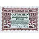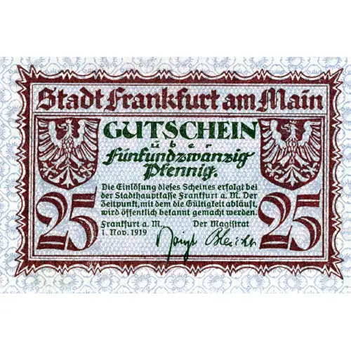 Stadt Frankfurt am Main Gutschein über 25 Pfennig Die Einlösung diese Scheines erfolgt über die Stadthauptkasse Frankfurt a. M. Der Zeitpunkt, mit dem die Gültigkeit abläuft, wird öffentlich bekannt gemacht werden. Frankfurt a. M. 1. Nov. 1919 Der Magistrat (Translation: City of Frankfurt am Main Voucher worth 25 pfennigs This note is redeemed at the city main cash register Frankfurt a. M. The date on which the valdity expires will be made public. Frankfurt a. M. November 1, 1919 The magistrate) |