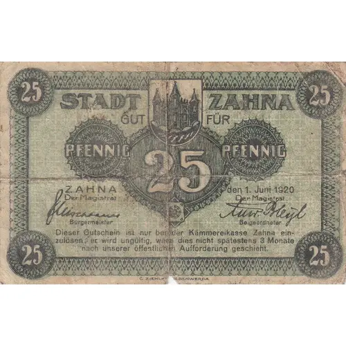 STADT ZAHNA GUT FÜR PFENNIG 25 PFENNIG ZAHNA den 1. Juni 1920 Der Magistrat / Der Magistrat Bürgermeister / Beigeordneter Dieser Gutschein ist nur bei der Kämmereikasse Zahna ein- zulösen; er wird ungültig, wenn dies nicht spätestens 3 Monate nach unserer öffentlichen Aufforderung geschieht. |