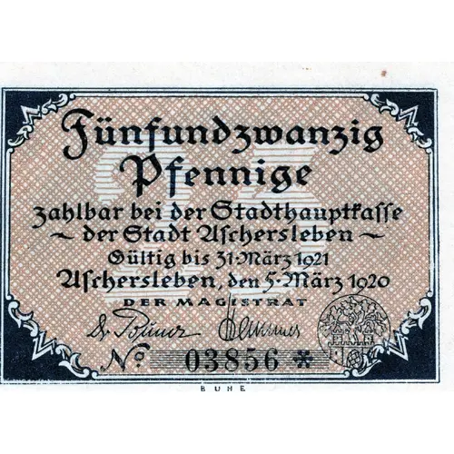 | Obverse lettering | Fünfundzwanzig Pfennige zahlbar bei der Stadthauptasse der Stadt Aschersleben Gültig bis 31 März 1921 Aschersleben, den 5 März 1920 Der Magistrat |