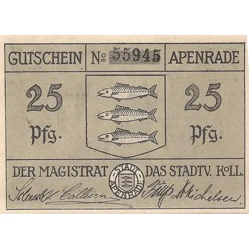 | Obverse lettering | GUTSCHEIN APENRADE 25 Pfg. DER MAGISTRAT DAS STADTV. K°LL. |