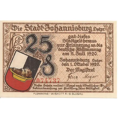 25P Die Stadt Johannisburg Ostpr. gab dieses Stadtgeld heraus Zur Frinnerung an die deutsche Abstimmung am 11. Juli 1920. Johannisburg Ostpr. den 1. Oktober 1920. Der Magistrat (Signature) Dieser Schein verliert 1 Monat nach öffentlicher Bekanntmachung zur Einlösung seine Gültigkeit FLEMMING - WISKOTT A. - G. GLOGAU (Translation: 25P The city of Johannisburg East Prussia. gave this City money out As a reminder of the German vote on July 11, 1920. Johannisburg Ostpr. October 1st, 1920. The magistrate (Signature) This ticket expires 1 month after public Notice of redemption FLEMMING - WISKOTT A. - G. GLOGAU) |