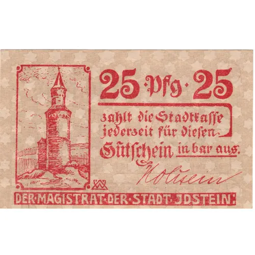 Opis rewersu Lettering (regular font): 25 Pfg. 25 zahlt die Stadtkasse jederzeit für diesen Gutschein in bar aus. [Signature] DER MAGISTRAT DER STADT IDSTEIN: