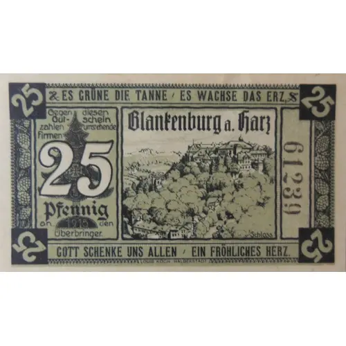 Dieser Gutschein verliert seine Gültigkeit, wenn er nicht innerhalb dreier Monate nach öffentlicher Aufforderung im Blankenburger Kreisblatt zur Einlösung bei nebenstehenden Firmen gelangt. (Translation: This voucher loses its validity if it is not redeemed at the companies listed below within three months of being publicly requested in the Blankenburger Kreisblatt.) |