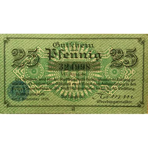 | Obverse lettering | 25 25 Gutschein über Pfennig 324998 VII. Ausgabe Dieser Gutschein wird von der Stadhauptkasse Recklinghausen in Zahlung genommen. Er verliert seine Gültigkeit einen Monat nach Aufkündigung in den heilegen Tageszeitungen. Die Stadt Recklinghausen haftet für die Einlösung. Recklinghausen, den 1. Dezember 1920 Der Magistrat: Oberbürgermeister. |