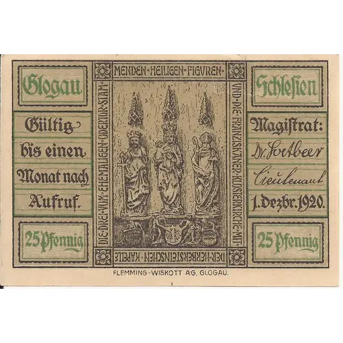 | Obverse lettering | Glogau Schlesien Gültig bis einen Monat nach Aufruf. Magistrat: Dr. Svetbeer Lieutenant 1. Dezbr. 1920. 25 Pfennig DIE ◦ DREI ◦ VOM ◦ EHEMALIGEN ◦ ODERTOR ◦ STAM- MENDEN ◦ HEILIGEN ◦ FIGUREN ◦ UND ◦ DIE ◦ FRANZISKANER ◦ KLOSTERKIRCHE ◦ MIT ◦ DER ◦ HERBERSTEINSCHEN ◦ KAPELLE FLEMMING – WISKOTT A · G, GLOGAU. |