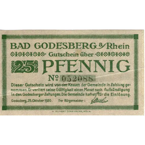 | Ön yüz lejandı | BAD GODESBERG a RHEIN Gutschein über 25 PFENNIG No. 052088 Dieser Gutschein wird von den Kassen der Gemeinde in Zahlung ge- nommen. Er verliert seine Gültigkeit einen Monat nach Aufkündigung in den Godesberger Zeitungen. Die Gemeinde haftet für die Einlösung. Godesberg, 25. Oktober 1920. Der Bürgermeister: M. DUMONT SCHAUBERG, KÖLN. |