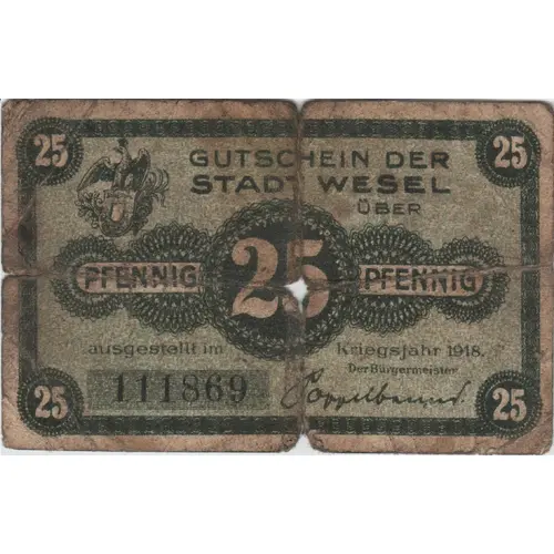 | Legenda del dritto | GUTSCHEIN DER STADT WESEL PFENNIG 25 PFENNIG |