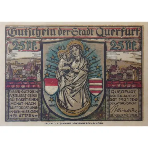 Gutschein der Stadt Querfurt 25 Pf. DIESER GUTSCHEIN VERLIERT SEINE GÜLTIGKEIT EINEN MONAT NACH AUFFORDERUNG IN DEN HIESIGEN BLÄTTERN QUERFURT, DEN 24. AUGUST 1921 DER MAGISTRAT BÜRGERMEISTER (Translation: Voucher from the city of Querfurt 25 pfennigs This voucher expires one month after being requested in the local newspapers Querfurt, August 24, 1921 The magistrate Mayor) |