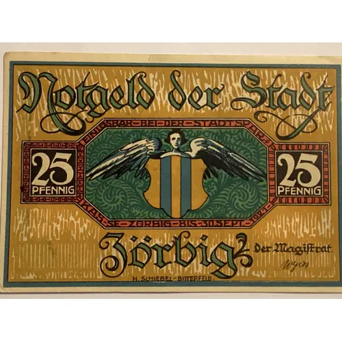 NOTGELD DER STADT ZÖRBIG 25 PFENNIG(2) Einlosbar bei der Stadtsparkasse ZÖRBIG bis 30,Sept 1921 Der Magistrat H.Schiebel,Bitterfeld. |