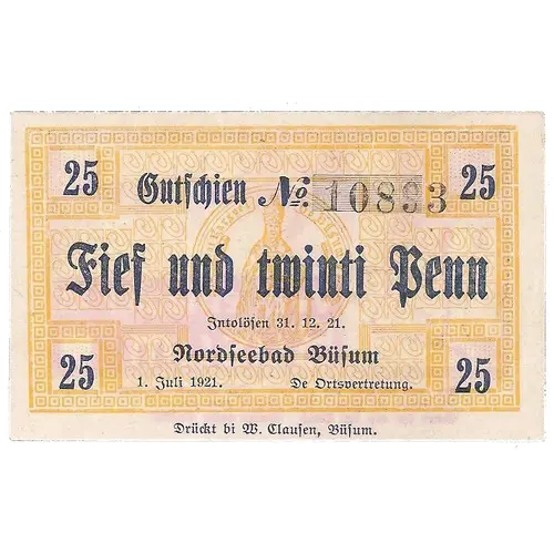 | Obverse lettering | Fief und tminti Benn intolofen 31.12.21 Nordseebad Busum |