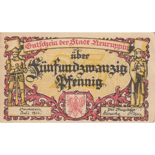 | Obverse lettering | Gutschein der Stadt Neuruppin über Fünfundzwanzig Pfennig Neuruppin, Juli 1921. Der Magistrat |