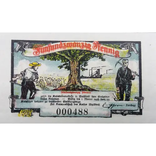 | Chữ khắc mặt trước | Fünfundzwanzig Pfennig zahlt die Kreiskomunalkasse in Waldbröl dem Einlieferer dieses Scheines - Gültig bis 1 Monat nach dem im Kreisblatt bekannt zu machenden Einlösungstage. Der Kreisausfschub der Kreises Waldbröl Landrat 000488 |
