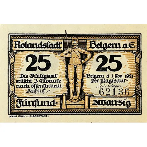 | Obverse lettering | Rolandstadt Belgern a.E. 25 Die Gültigkeit erlischt 3 Monate nach öffentlichem Aufruf Belgern d. 1. Nov. 1921. Der Magistrat: Lederbogen Fünfund- zwanzig LOUIS KOCH - HALBERSTADT. |
