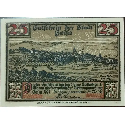 Gutschein der Stadt Geisa Dieser Gutschein verliert Seine Gültigkeit 1 Monat nach ortsüblicher Bekannfmachung Geisa 1921 Der Gemeindevorsland: (Translation: Voucher from the city of Geisa This voucher loses its validity 1 month after the usual local announcement by Geisa 1921 The municipal council:) |