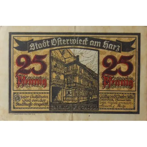 Stadt Osterwieck am Harz 25 Pfennig ALTE HOLZBAUTEN GASTHOF ZUR TANNE Dieser Gutschein wird von der Stadtkasse eingelöst. Gültig bis 31.Dezbr.1921 DER MAGISTRAT (Translation: City of Osterwieck at the Harz mountains 25 pfennigs Old wooden buildings Inn to the fir tree This voucher will be redeemed by the city treasury. Valid until December 31, 1921 The Magistrate) |