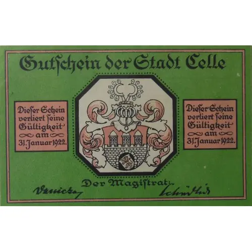 Obverse lettering Gutschein der Stadt Celle Dieser Schein verliert seine Gültigkeit am 31. Januar 1922 Der Magistrat