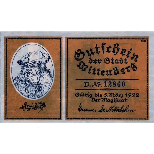 GUTSCHEIN DER STADT WITTENBERG D Gültig bis 5.März 1922 Der Magistrat (Translation: VOUCHER FROM THE CITY OF WITTENBERG D Valid until March 5, 1922 The magistrate) |