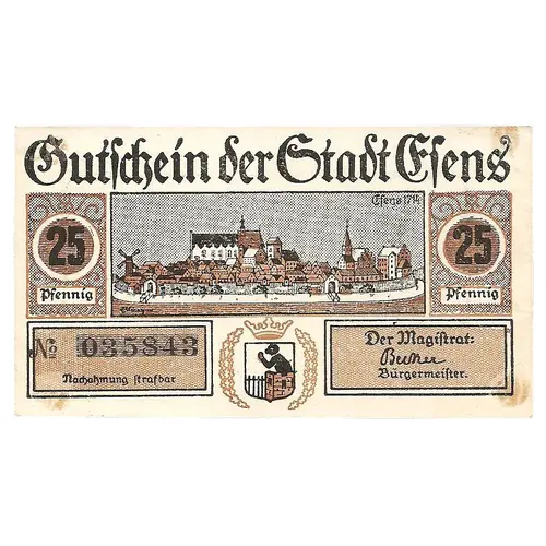 | Obverse lettering | gutschein der stadt esens 25 pfennig |