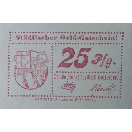 | 表面の銘文 | Städtischer Geld-Gutschein! 25 Pfg. Der Magistrat der Stadt Gottesberg. Stadtblatt-Druckerei Gottesberg |
