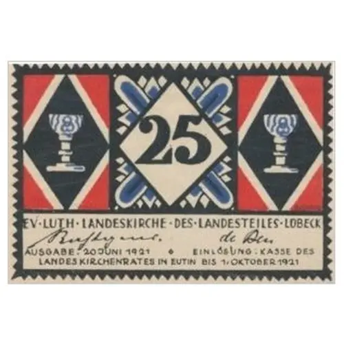 EV . LUTH . LANDESKIRCHE . DES . LANDESTEILES . LÜBECK AUSGABE . 20. JUNI 1921 EINLÖSUNG : KASSE DES LANDESKIRCHENRATES IN EUTIN BIS 1. OKTOBER 1921 (Translation: Evangelical Lutheran National Church of the District of Lübeck Issue June 20, 1921 Redemption: Cash of the State Council of Churches in Eutin until 1 October 1921) |