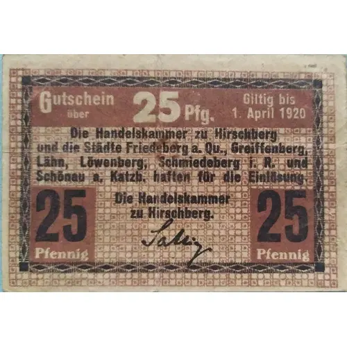 نوشته‌های روی اسکناس Die Handelskammer zu Hirschberg und die Stadte Friedeberg a. Qu., Greiffenberg, Lahn, Lowenberg, Schmiedeberg i. R. und Schonau a. Katzb. haften fur die Einlusung, Die Handelskammer zu Hirschberg