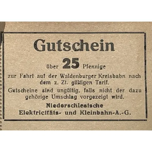 | Obverse lettering | Gutschein über 25 pfennige zur Fahrt auf der Waldenburger Kreisbahn nach dem z. Zt. gültigen Tarif. Gutscheine sind ungültig, falls nichtder dasu gehörige Umschlag vorgezeigt wird. Niederschlesische Elektricitäts und Kleinbahn A.G. (Translation: Voucher for 25 pfennigs for travel on the Waldenburg District Railway according to the currently valid tariff. Vouchers are invalid unless the appropriate envelope is presented. Lower Silesian Electricity and Light Railway S.A.) |