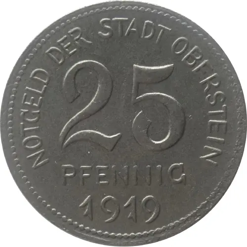 | Obverse lettering | NOTGELD DER STADT OBERSTEIN 10 PFENNIG 1919 |