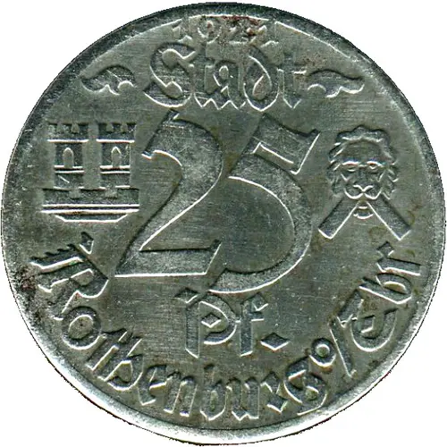 | Obverse lettering | 1921 Stadt 25 Pf Rothenburg o/Tbr |