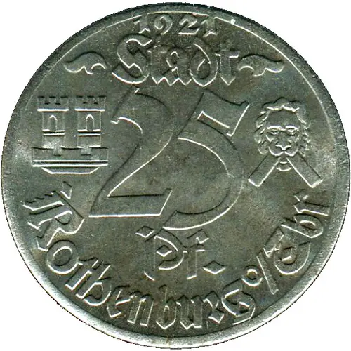 | Obverse lettering | 1921 Stadt 25 Pf Rothenburg o/Tbr |