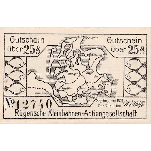 (Translation: Coupon over 25 Phennig. Rugensche Small Railways Corporation. Stettin, June 1921.) |