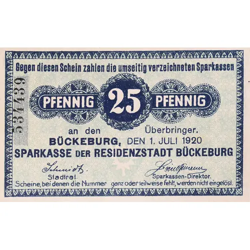 Gegen diesen Schein zahlen die umseitig verzeichneten Sparkassen PFENNIG 25 PFENNIG an den Überbringer. BÜCKEBURG, DEN 1, JULI 1920 SPARKASSE DER RESIDENZSTADT BÜCKEBURG (signatures) Stadtrat Sparkassen-Direktor Scheine, bei denen oie Nummer ganz oderteilweise fehlt, werden nicht eingelösi. (Translation: The savings banks listed on reverse pay against this note PFENNIG 25 PFENNIG to the bearer. BÜCKEBURG, JULY 1, 1920 Savings Bank OF THE RESIDENCE CITY BÜCKEBURG (signature) (signature) City Council Savings Banks Director Notes with no or part of the number will not be redeemed.) |