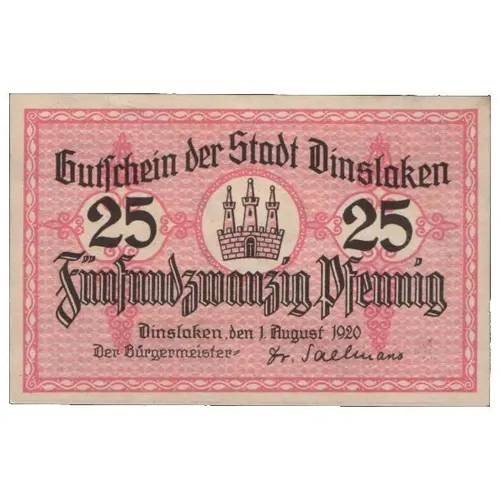Gutschein der Stadt Dinslaken 25 25 Funfundzwanzig Pfennig Dinslaken den 1 August 1920 der Burgermeister (Translation: Voucher from the city of Dinslaken 25 25 Twenty-five pfennigs Dinslaken, August 1, 1920 The Mayor) |