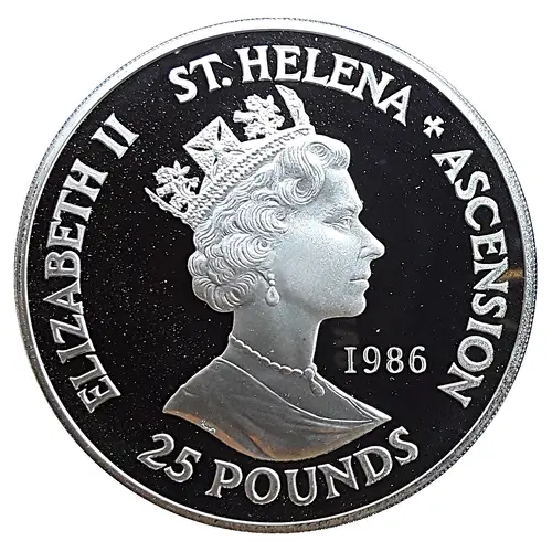 | Obverse lettering | ELIZABETH II ST.HELENA + ASCENCION 1986 RDM 25 POUNDS |