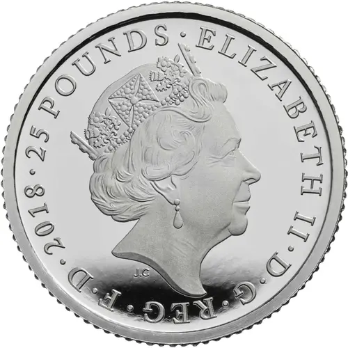 | Obverse lettering | ELIZABETH II·D·G·REG·F·D·2018·25 POUNDS· J.C (Translation: Elizabeth the Second by the Grace of God Queen Defender of the Faith) |