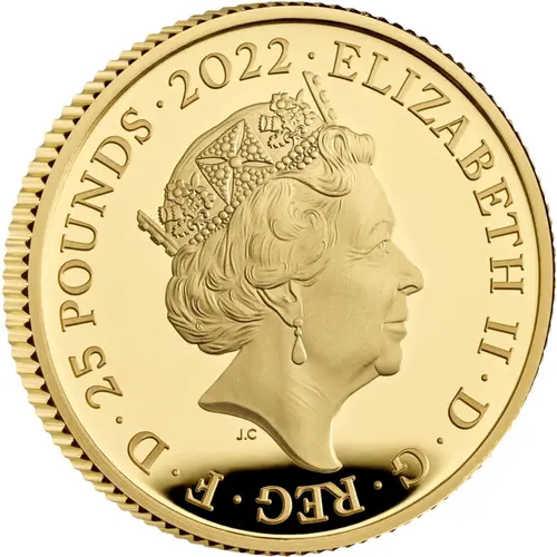 | نوشتههای روی سکه | ELIZABETH II·D·G·REG·F·D·25 POUNDS·2022· J.C (Translation: Elizabeth the Second by the Grace of God Queen Defender of the Faith) |