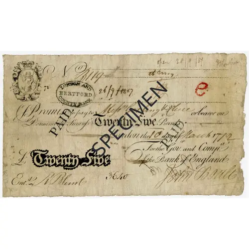 | Obverse lettering | 1771 BANK 26/9/1867 I Promise to pay to_ or Bearer on Demand the Sum of TWENTY FIVE Pounds London on the 10 day of March 1792 For the Govr and Compa of the Bank of England £TWENTY FIVE Ent.d |