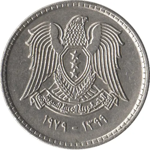 | 正面描述 | Coat of arms of Syria: hawk of Quraish with 3 stars on the shield holding a scroll with `Arab Republic of Syria` in arabic lettering. Dates (AD left and AH right) in arabic digits below. |