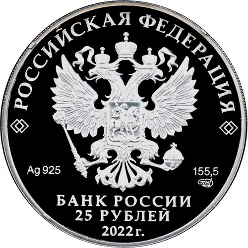 | Obverse lettering | РОССИЙСКАЯ ФЕДЕРАЦИЯ Ag 925 155,5 СПМД БАНК РОССИИ 25 РУБЛЕЙ 2022 г. (Translation: Russian Federation SPMD The Bank of Russia Roubles) |