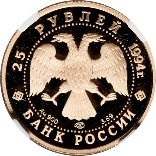 | Obverse description | The two-headed eagle (designed by I. Bilibin), the letters under it indicate the metal sign, the fineness, the mint trademark and the fine metal content. The inscriptions along the rim: at the top — «25 РУБЛЕЙ 1994 г.» (25 ROUBLES 1994), at the bottom — «БАНК РОССИИ» (BANK OF RUSSIA). |