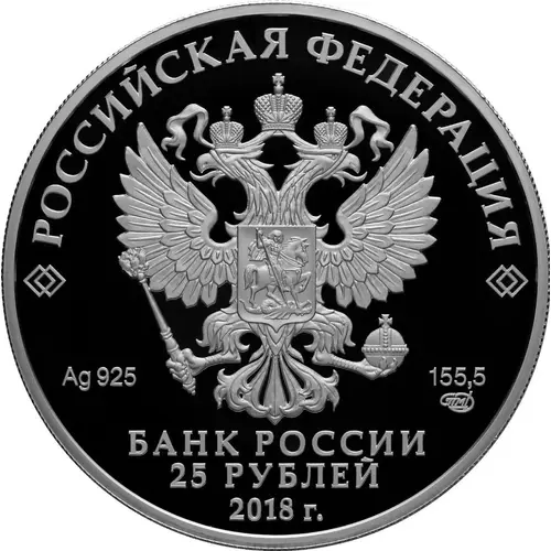 | Obverse lettering | РОССИЙСКАЯ ФЕДЕРАЦИЯ Ag 925 155,5 СПМД БАНК РОССИИ 25 РУБЛЕЙ 2018 г. (Translation: Russian Federation SPMD The Bank of Russia Roubles) |