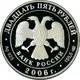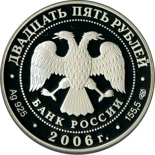 | 正面描述 | In the centre – the Emblem of the Bank of Russia [the two-headed eagle with wings down, lower – the semicircular inscription – «БАНК РОССИИ» (BANK OF RUSSIA)] framed by a circle of dots and inscriptions along the rim: at the top – «ДВАДЦАТЬ ПЯТЬ РУБЛЕЙ» (TWENTY FIVE ROUBLES), at the bottom – the year of issue «2006», the letters to the left indicate the metal sign and the fineness, to the right – the fine metal content and the mint trade mark. |