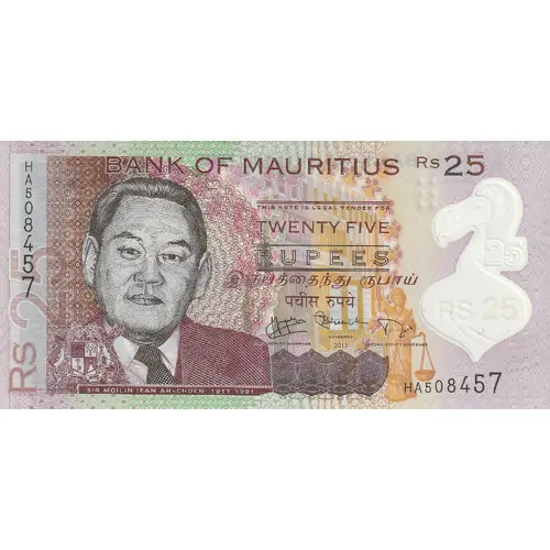 | Obverse lettering | Bank of Mauritius This note is legal tender for Twenty Five Rupees Rs25 |